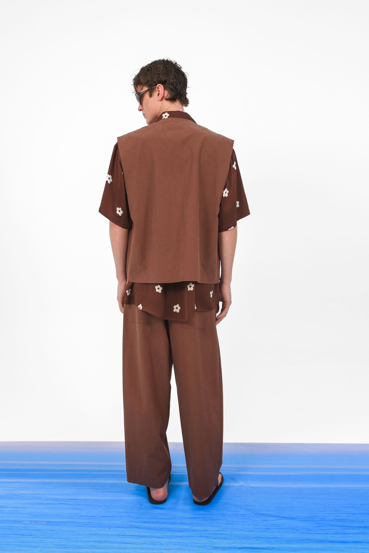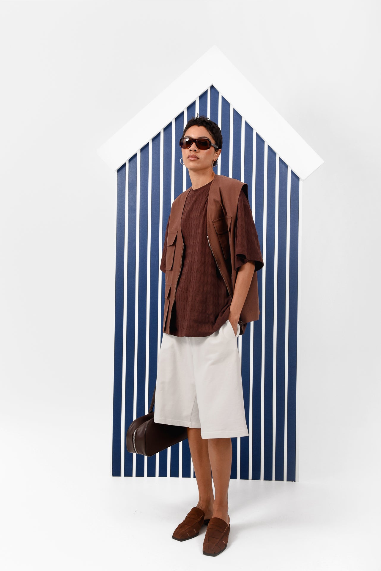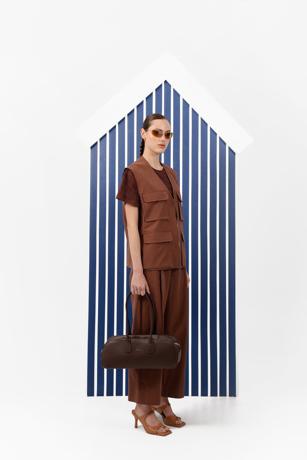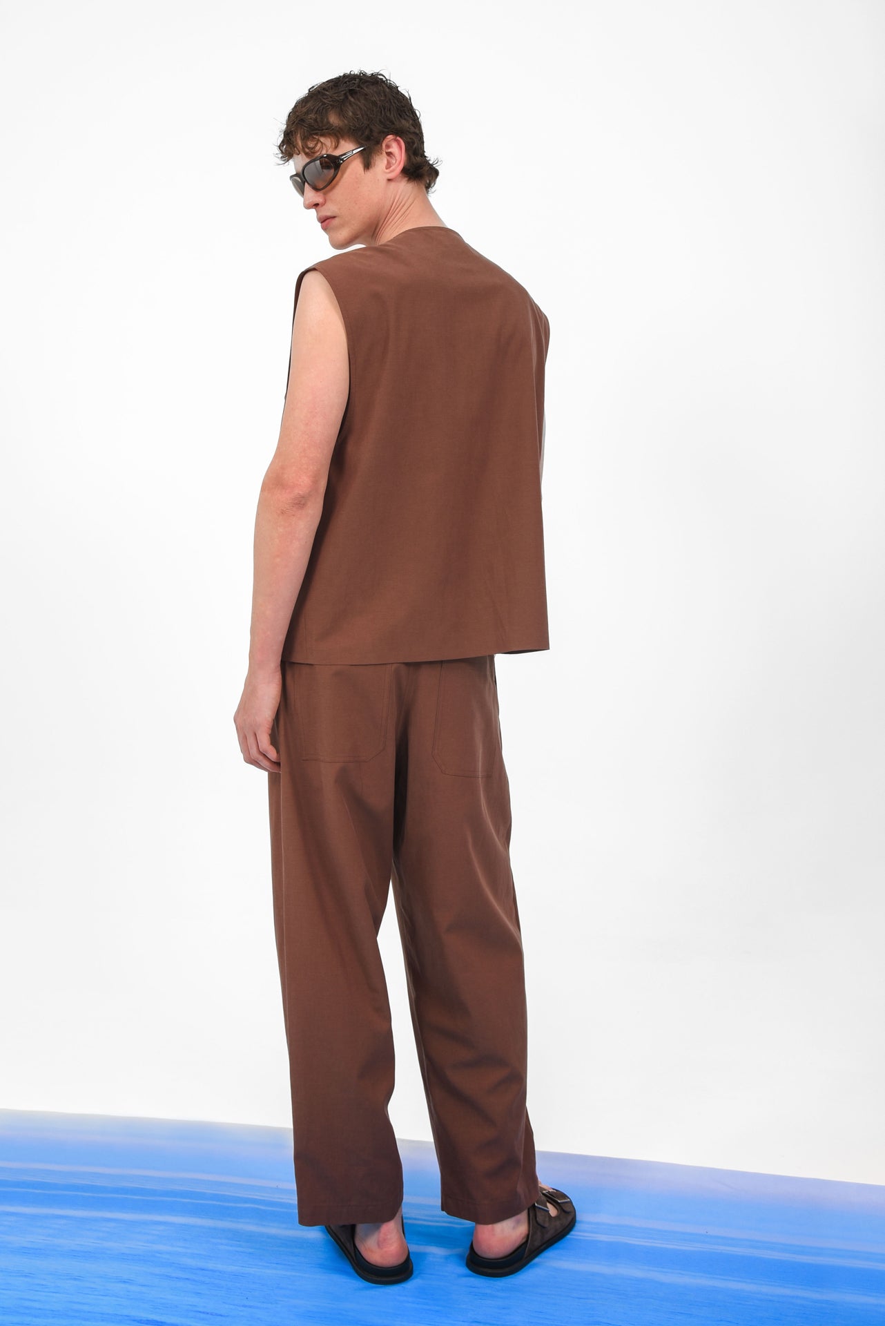 A structured sleeveless vest designed with a clean, utilitarian silhouette. Featuring a front zip closure and multiple flap pockets, it combines functionality with modern tailoring. The straight fit and lightweight fabric make it an easy layering piece, adding a refined yet relaxed edge to everyday styling.