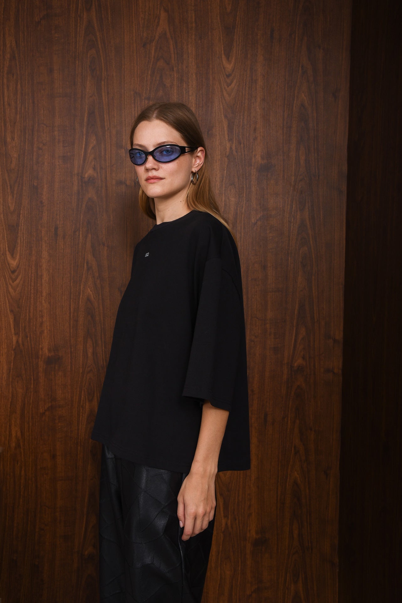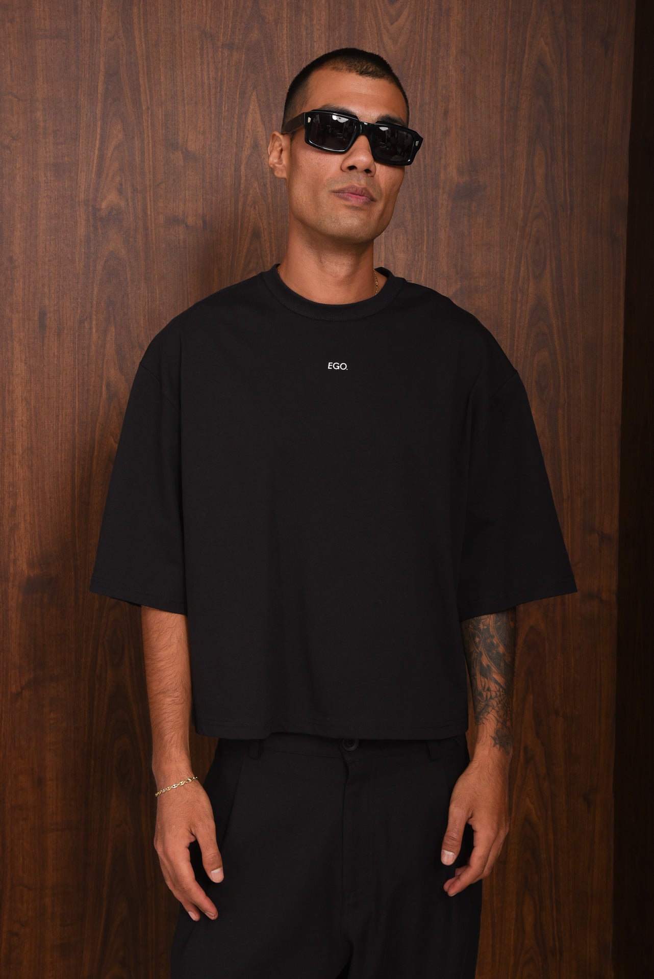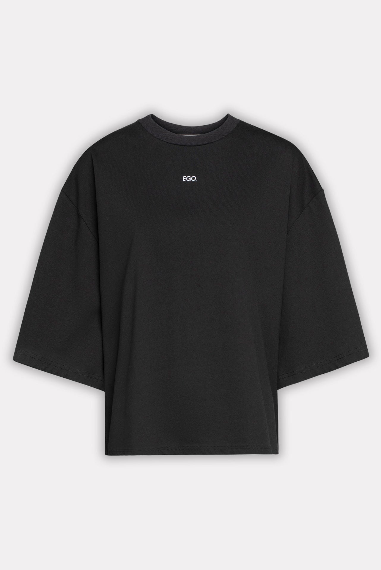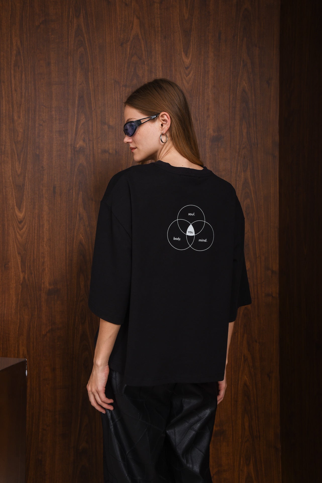 The Soul t-shirt is made from soft cotton with an oversized fit and dropped shoulders. It features a round neckline, short wide sleeves, boxy shape and "EGO", collections' name printed on the chest. The back shows a graphic with “Soul, Body, Mind, You” in a circle design. Comfortable and versatile, it pairs easily with any look.