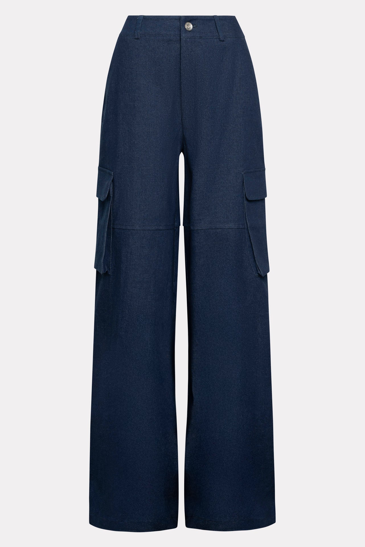 The Trust denim pants feature a wide-leg cargo design with a relaxed, oversized fit. Made from deep blue denim, they include belt loops, a button and zip closure, large flap side pockets, and back pockets for utility style.